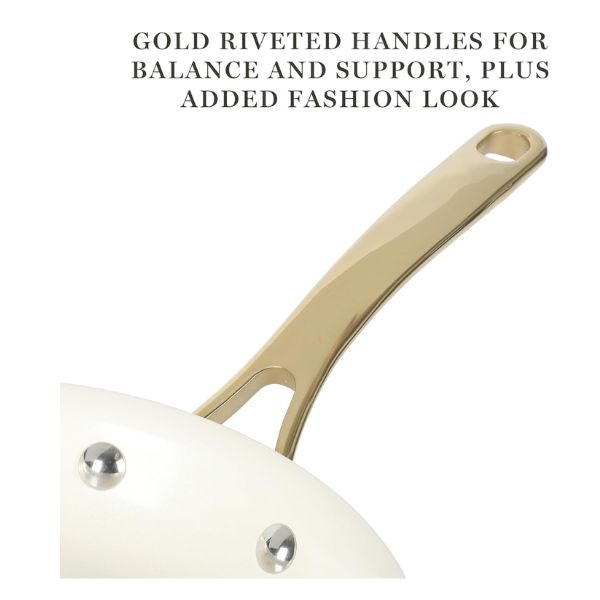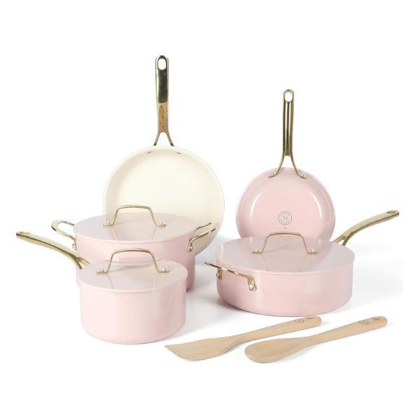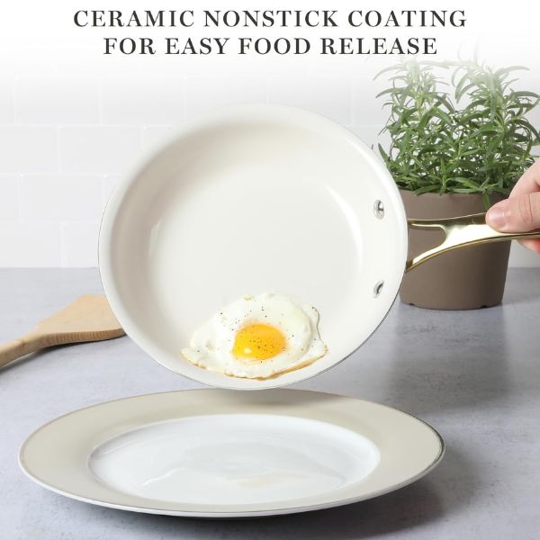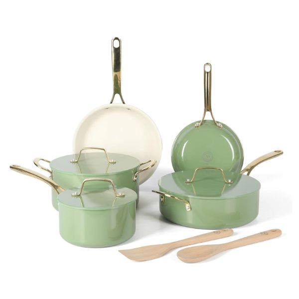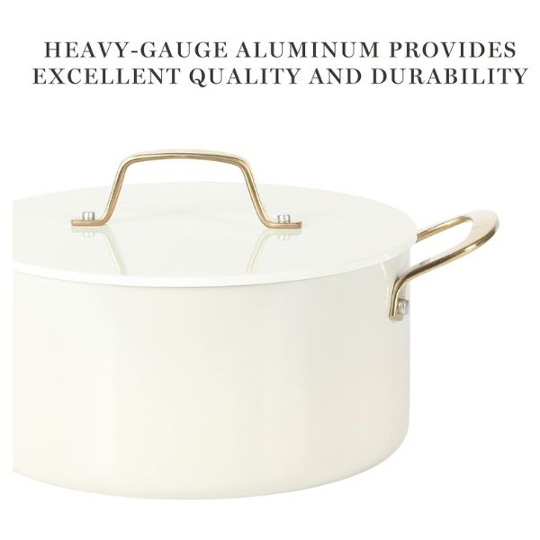 El juego de ollas antiadherentes Martha Stewart Galway está fabricado en aluminio de calidad pesada, ofrece una distribución uniforme del calor. Compatible con estufas de gas, eléctricas, halógenas, de cerámica y vidrio, cuenta con un elegante exterior de esmalte brillante resistente a manchas y decoloración. Ideal para hornear hasta 480°F y apto para lavavajillas, es una opción elegante y funcional para cualquier cocina.