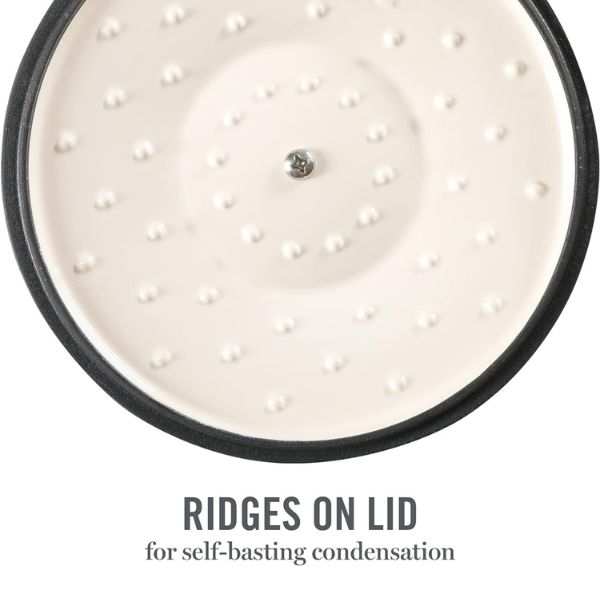 Por otra parte, una característica destacada de la Olla Martha Stewart Eastholm es su tapa autohilvanante. Las protuberancias debajo de la tapa recogen la humedad mientras cocinas, redirigiendo los jugos de vuelta a la comida. De esta manera, esto resulta en platos más jugosos y tiernos, mejorando el sabor y la textura de tus recetas. Por lo tanto, esta función es ideal para preparar guisos y estofados que requieren una cocción lenta y uniforme.