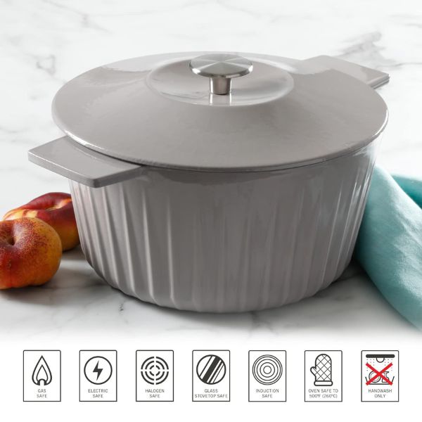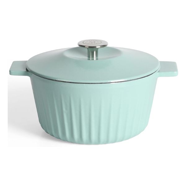 La Olla Martha Stewart Eastholm hecha de hierro fundido esmaltado, ofrece durabilidad y una tapa autohilvanante para resultados jugosos. Apta para varias estufas y horno, soporta hasta 500 °F. Disponible en colores vibrantes, es perfecta para cocinar, hornear y servir elegantemente del horno a la mesa.
